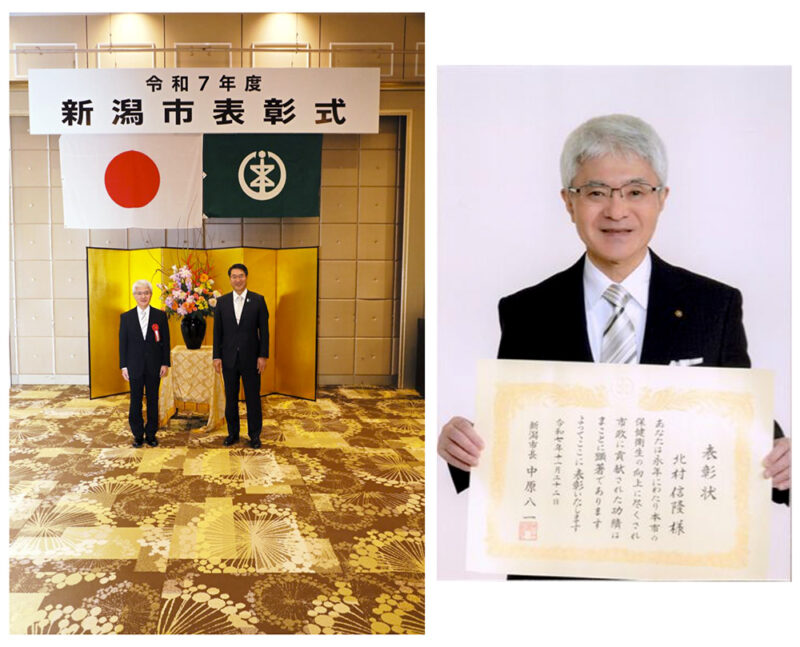 当法人の北村信隆研究理事が長年の市政への貢献が評価され、新潟市から表彰されました。 2025年11⽉22⽇ 本表彰は、市政の進展や市民福祉の増進などに多大な功労のあった人物を称えるもので、新潟市の表彰制度における最高位の栄誉とされています。 この名誉ある賞を、当法人の北村理事が受賞いたしました。今回の受賞は、多年にわたり保健衛生の向上に尽力し続けた、北村理事の献身的な功績が評価されたものです。当法人といたしましても、その長きにわたる功労に対し、改めて深い敬意と感謝の意を表します。 « 前の記事へ一覧